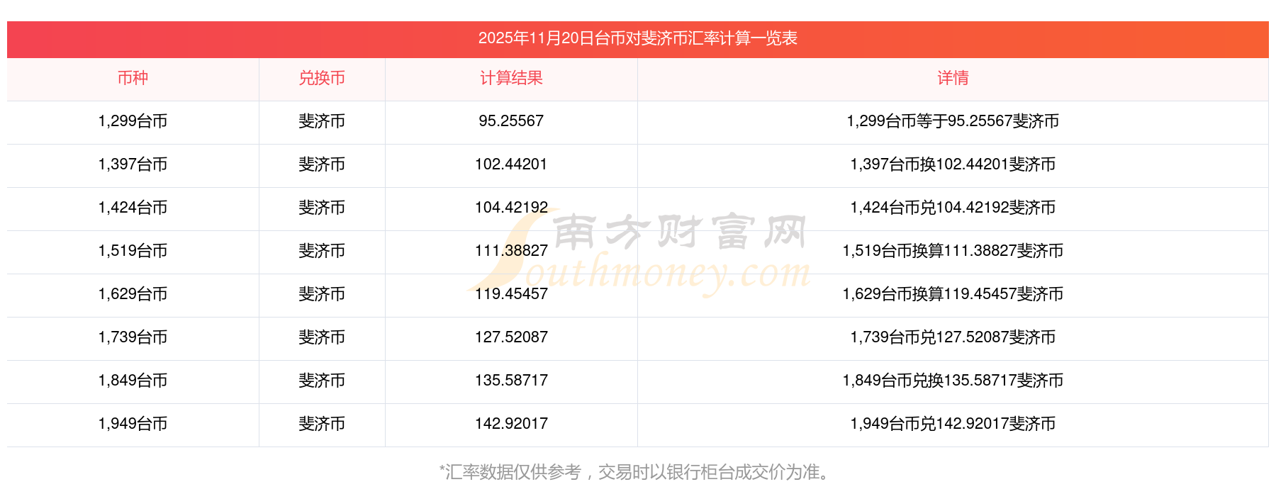2025年11月20日今天汇率,换算台币(TWD)到斐济币(FJD):