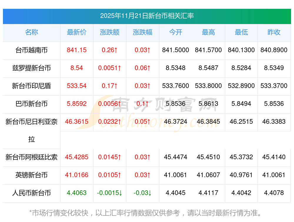根据2025年11月21日汇率,新台币兑换兹罗提汇率最新价0.117100,今开价0.1172,昨收价0.1172,最高价0.1173,最低价0.1170。