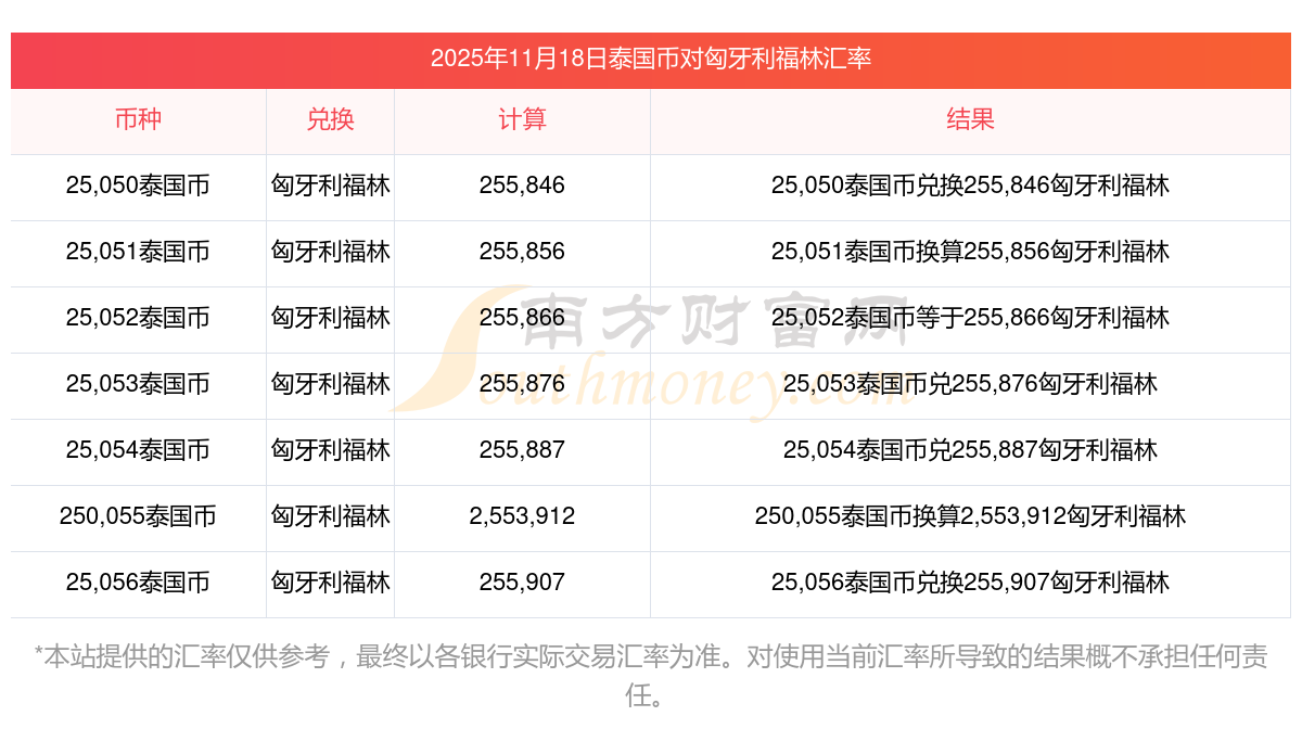 2025年11月18日泰国币与匈牙利福林的兑换汇率计算如下: