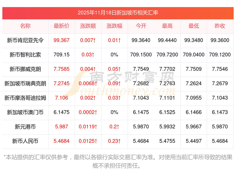 根据2025年11月18日汇率,新加坡币兑换澳门币汇率最新价6.147500,今开价6.1475,昨收价6.1473,最高价6.1525,最低价6.1466。