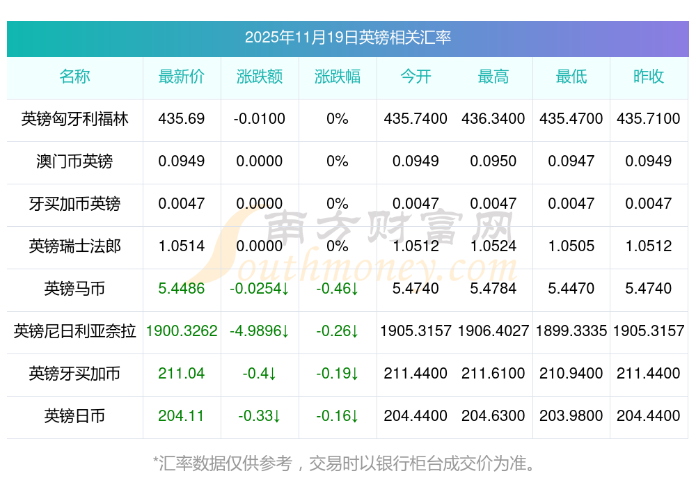 根据2025年11月19日汇率,英镑兑换卢布汇率最新价106.361200,今开价106.4301,昨收价106.4301,最高价106.5150,最低价106.2965。