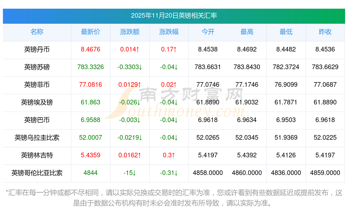 2025年11月20日英镑兑换哥伦比亚比索最新汇率:4844.000000,今开:4858.0000,昨收:4859.0000,最高:4860.0000,最低:4836.0000。