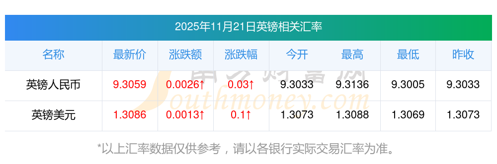根据2025年11月21日汇率计算,英镑兑换人民币汇率最新价9.305900,今开价9.3033,昨收价9.3033,最高价9.3136,最低价9.3005。