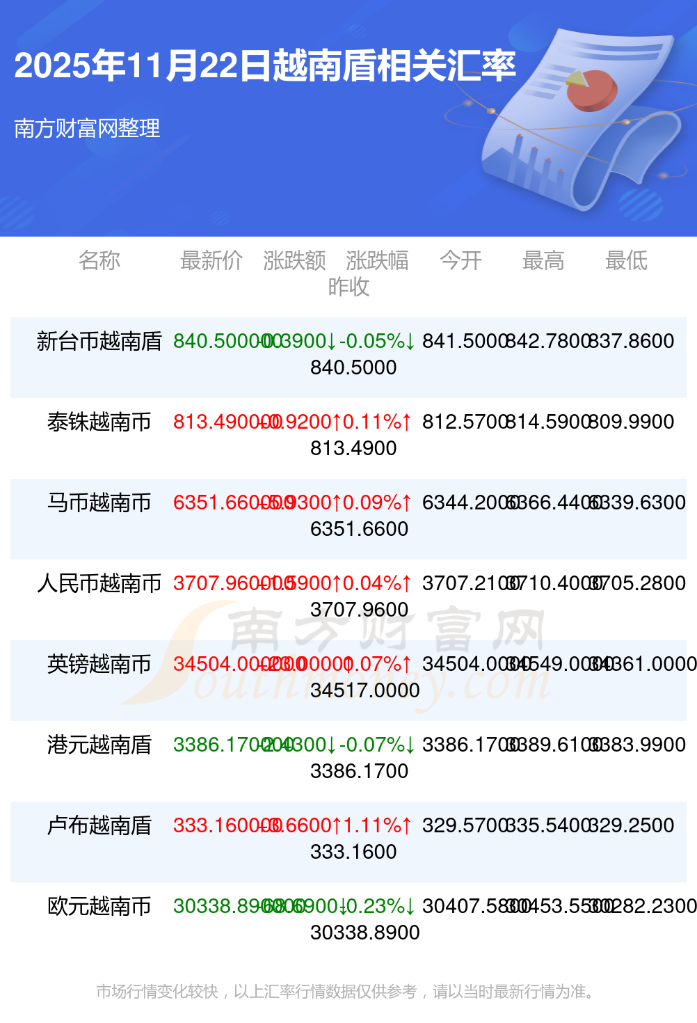 根据今天2025年11月22日汇率计算,VND兑换CDF汇率最新价0.086420,今开价0.0864,昨收价0.0864,最高价0.0865,最低价0.0840。