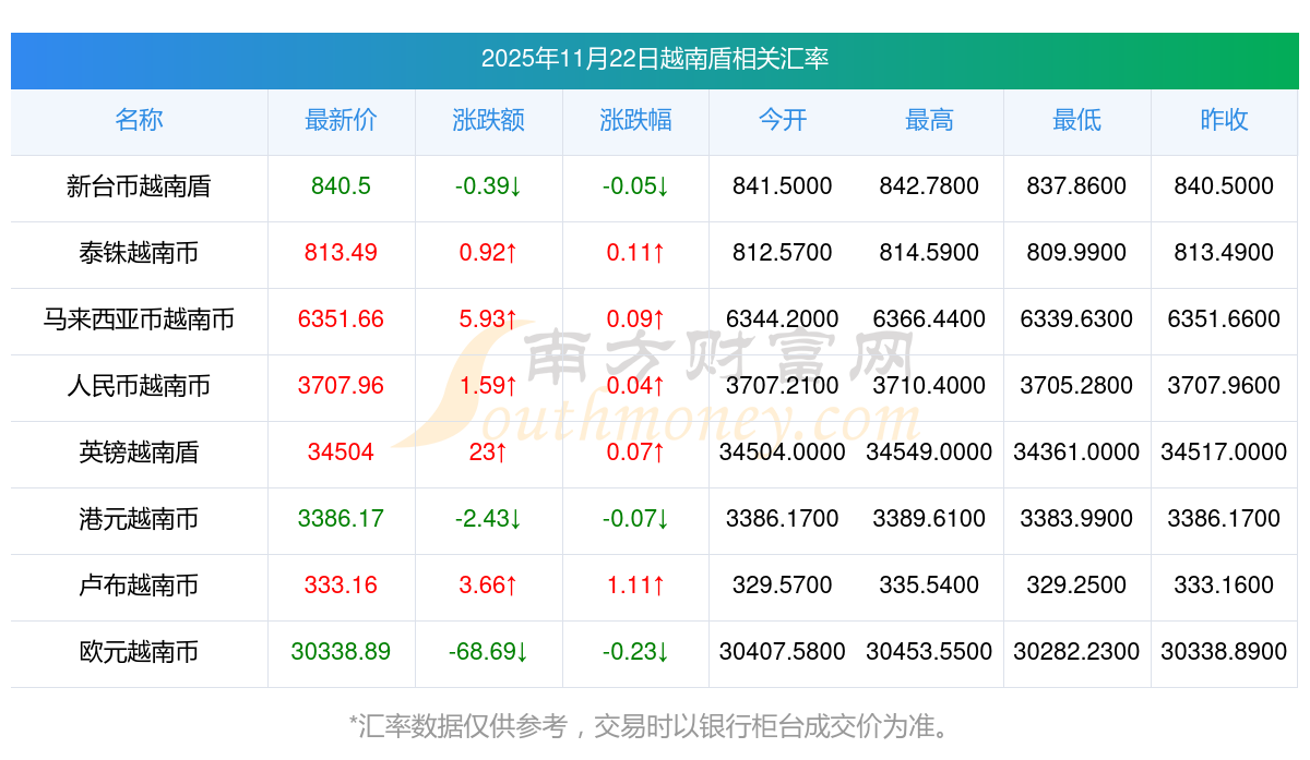 根据今天2025年11月22日汇率计算,VND兑换MXN汇率最新价0.000701,今开价0.0007,昨收价0.0007,最高价0.0007,最低价0.0007。