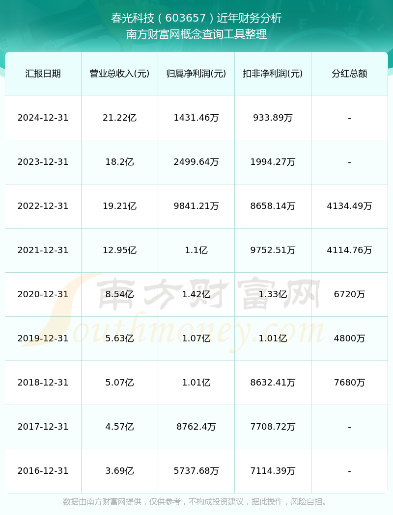 春光科技公司2024年实现营业收入21.22亿元,同比增长16.62%;净利润1431.46万元,同比增长-42.73%;毛利率10.59%。