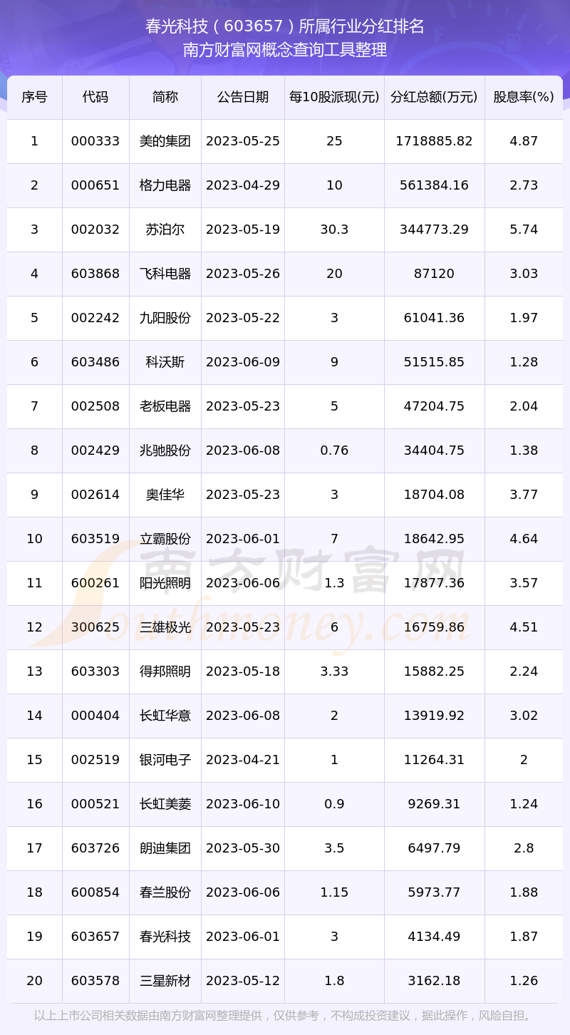 按照开云手机web版登录入口趋势选股系统统计,春光科技所属行业为家电行业行业,家电行业行业分红排名情况如下表: