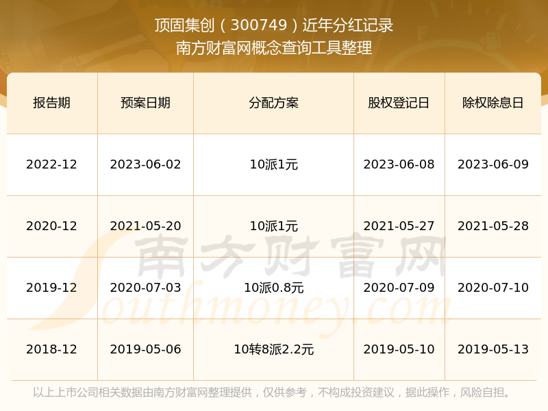 顶固集创最新一次公布的分红方案为10派1元。本次权益分派股权登记日为2023年6月8日,除权除息日为2023年6月9日,派息日为2023年6月9日。