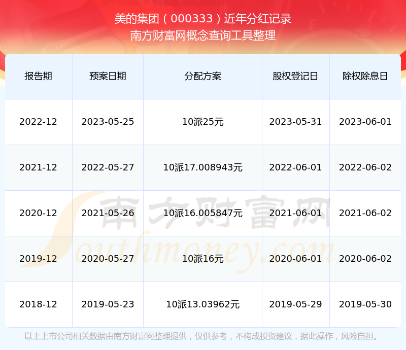 美的集团最新一次公布的分红方案为10派25元。本次权益分派股权登记日为2023年5月31日,除权除息日为2023年6月1日,派息日为2023年6月1日。