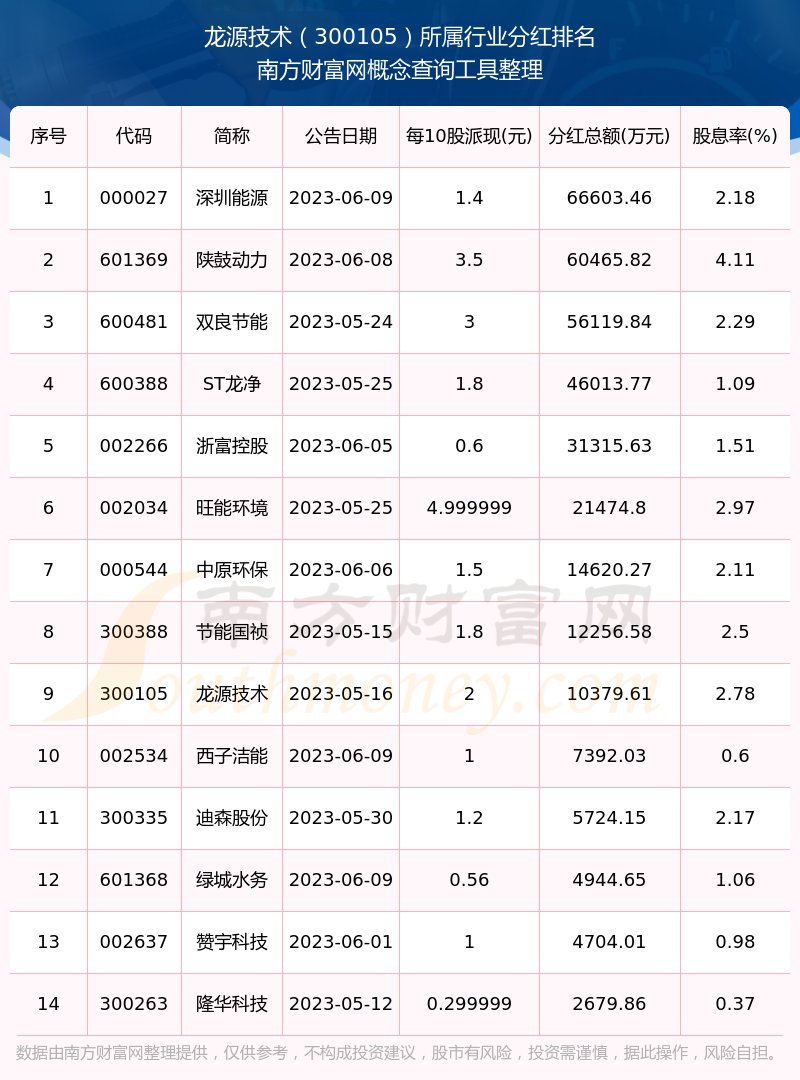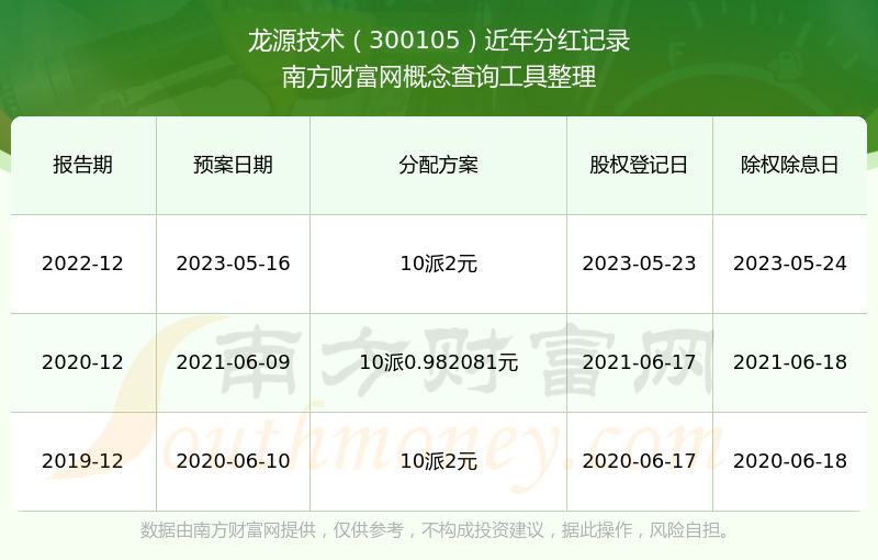 龙源技术最新一次公布的分红方案为10派2元。本次权益分派股权登记日为2023年5月23日,除权除息日为2023年5月24日,派息日为2023年5月24日。