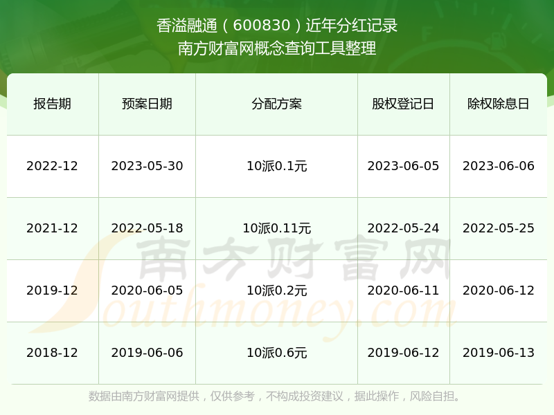 香溢融通最新一次公布的分红方案为10派0.1元。本次权益分派股权登记日为2023年6月5日,除权除息日为2023年6月6日,派息日为2023年6月6日。