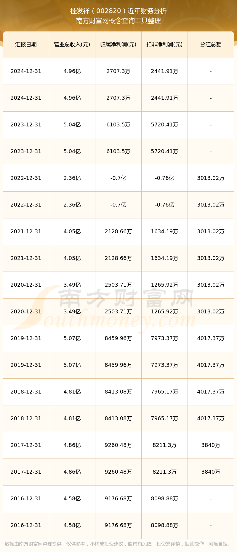 2024年桂发祥总营收4.96亿,同比增长-1.64%;净利润2707.3万,同比增长-55.64%;销售毛利率46.05%。
