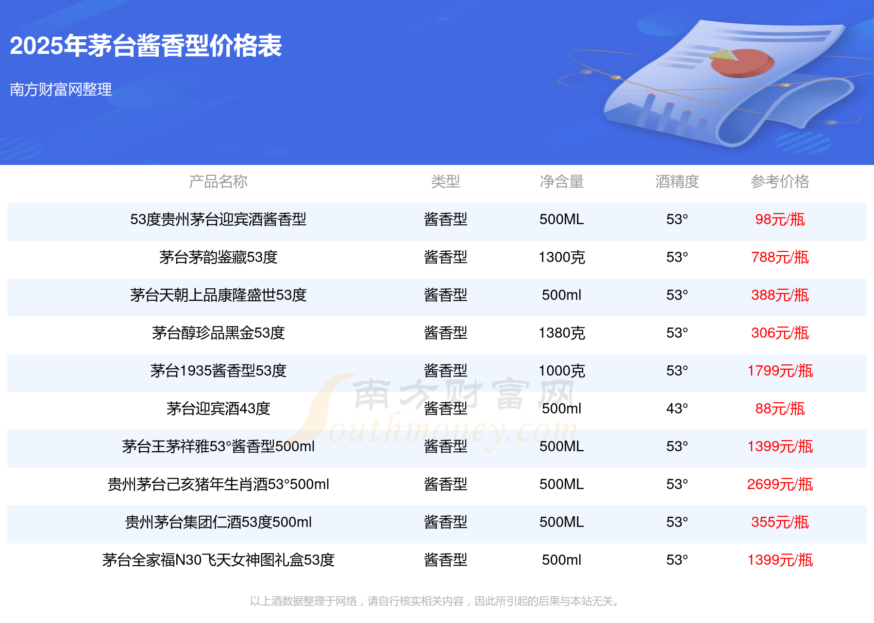 2025年,茅台酱香型酒价格最高的是华茅鉴藏 酱香型白酒 3L 53°,参考价8388元,最低的是汉董酒陈酿酒53度,参考价79元,价格高低差为8309元。