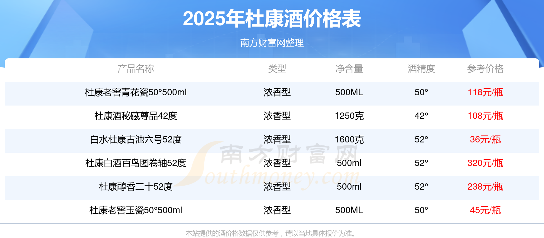 杜康白酒百鸟图卷轴52度参考价320元/瓶、杜康醇香二十52度参考价238元/瓶、杜康老窖青花瓷50°500ml参考价118元/瓶、杜康酒秘藏尊品42度参考价108元/瓶、杜康老窖玉瓷50°500ml参考价45元/瓶、白水杜康古池六号52度参考价36元/瓶。