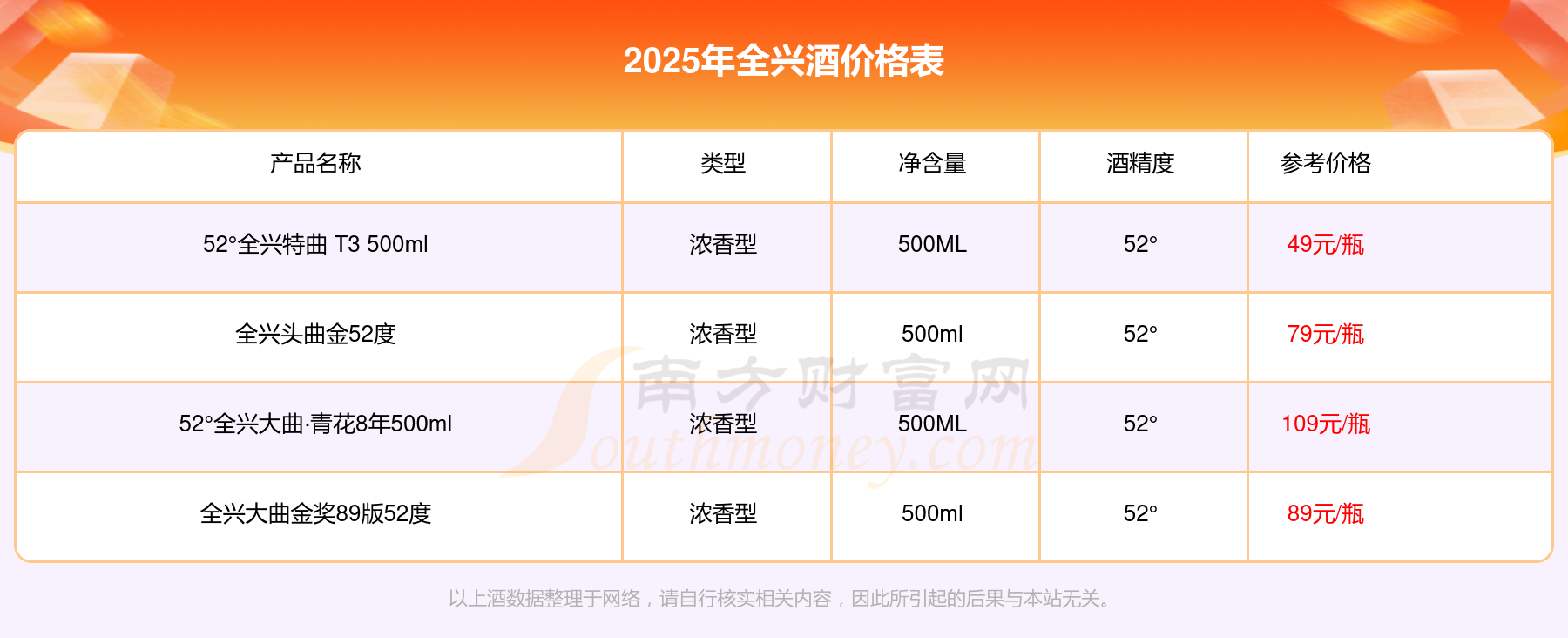 2025年全兴价格最高的酒是52°全兴大曲·青花8年500ml,参考价109元/瓶,最低的是52°全兴特曲 T3 500ml,参考价49元/瓶,价格高低差为60元/瓶。