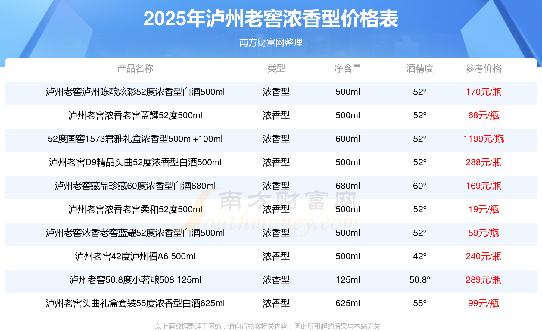 泸州老窖浓香型酒最新价格2025:泸州老窖国窖1573春酿鼠兆丰年E 55度参考价17999元/瓶、泸州老窖国窖1573生命中的那坛酒55度014参考价9999元/瓶、泸州老窖国窖1573春酿鼠兆丰年A 55度参考价5088元/瓶、泸州老窖国窖1573生命中的那坛酒55度013浓香型白酒1000ml参考价4988元/瓶。