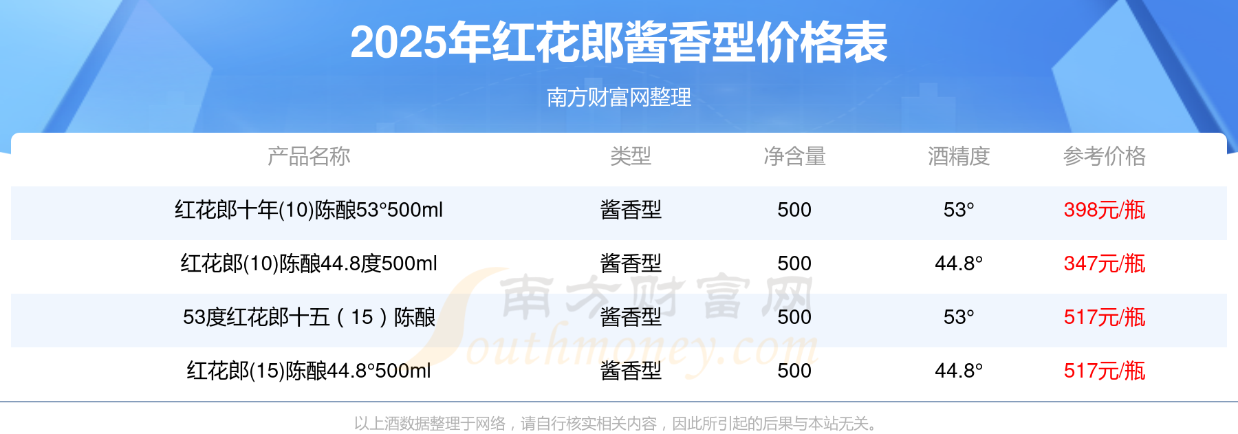 2025年红花郎酱香型酒53度红花郎十五(15)陈酿、红花郎(15)陈酿44.8°500ml、红花郎十年(10)陈酿53°500ml、红花郎(10)陈酿44.8度500ml等最新价格如下:53度红花郎十五(15)陈酿参考价517元/瓶、红花郎(15)陈酿44.8°500ml参考价517元/瓶、红花郎十年(10)陈酿53°500ml参考价398元/瓶、红花郎(10)陈酿44.8度500ml参考价347元/瓶。