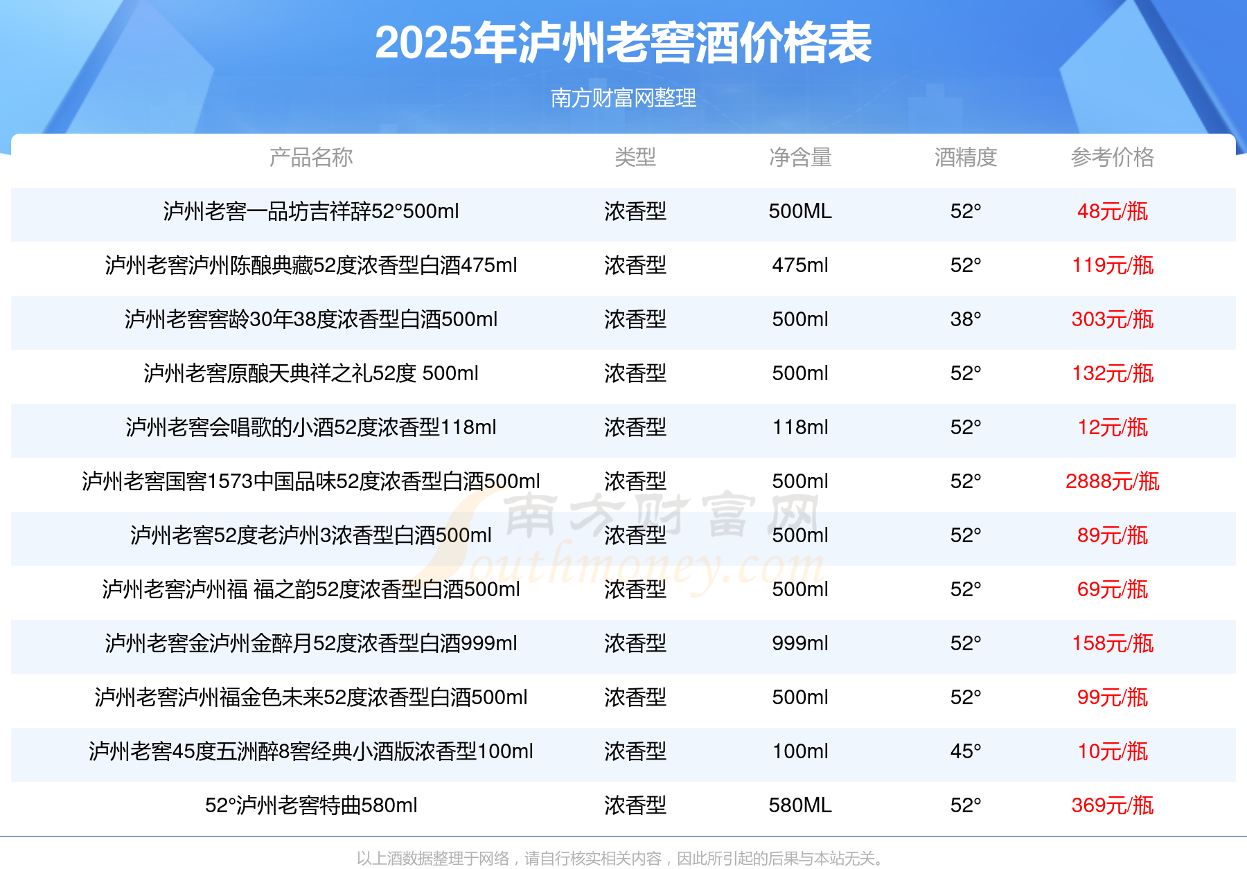 2025年,泸州老窖国窖1573春酿鼠兆丰年E 55度、泸州老窖国窖1573生命中的那坛酒55度014、泸州老窖国窖1573春酿鼠兆丰年A 55度、泸州老窖国窖1573生命中的那坛酒55度013浓香型白酒1000ml、泸州老窖国窖1573生命中的那坛酒55度009 1000ml、泸州老窖国窖1573中国品味52度浓香型白酒500ml、泸州老窖国窖1573许燎源概念作品58度浓香型白酒1000ml、泸州老窖52度国窖1573狗年生肖礼盒等泸州老窖酒价格如下:泸州老窖国窖1573春酿鼠兆丰年E 55度参考价17999元/瓶、泸州老窖国窖1573生命中的那坛酒55度014参考价9999元/瓶、泸州老窖国窖1573春酿鼠兆丰年A 55度参考价5088元/瓶、泸州老窖国窖1573生命中的那坛酒55度013浓香型白酒1000ml参考价4988元/瓶、泸州老窖国窖1573生命中的那坛酒55度009 1000ml参考价4288元/瓶、泸州老窖国窖1573中国品味52度浓香型白酒500ml参考价2888元/瓶、泸州老窖国窖1573许燎源概念作品58度浓香型白酒1000ml参考价2680元/瓶、泸州老窖52度国窖1573狗年生肖礼盒参考价2143元/瓶。