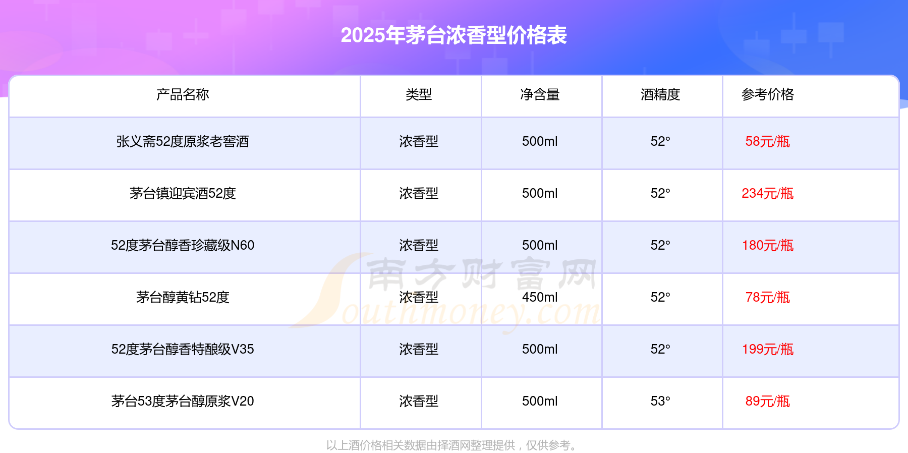 2025年茅台浓香型酒茅台镇迎宾酒52度、52度茅台醇香特酿级V35、52度茅台醇香珍藏级N60、茅台53度茅台醇原浆V20、茅台醇黄钻52度、张义斋52度原浆老窖酒等最新价格如下:茅台镇迎宾酒52度参考价234元/瓶、52度茅台醇香特酿级V35参考价199元/瓶、52度茅台醇香珍藏级N60参考价180元/瓶、茅台53度茅台醇原浆V20参考价89元/瓶、茅台醇黄钻52度参考价78元/瓶、张义斋52度原浆老窖酒参考价58元/瓶。