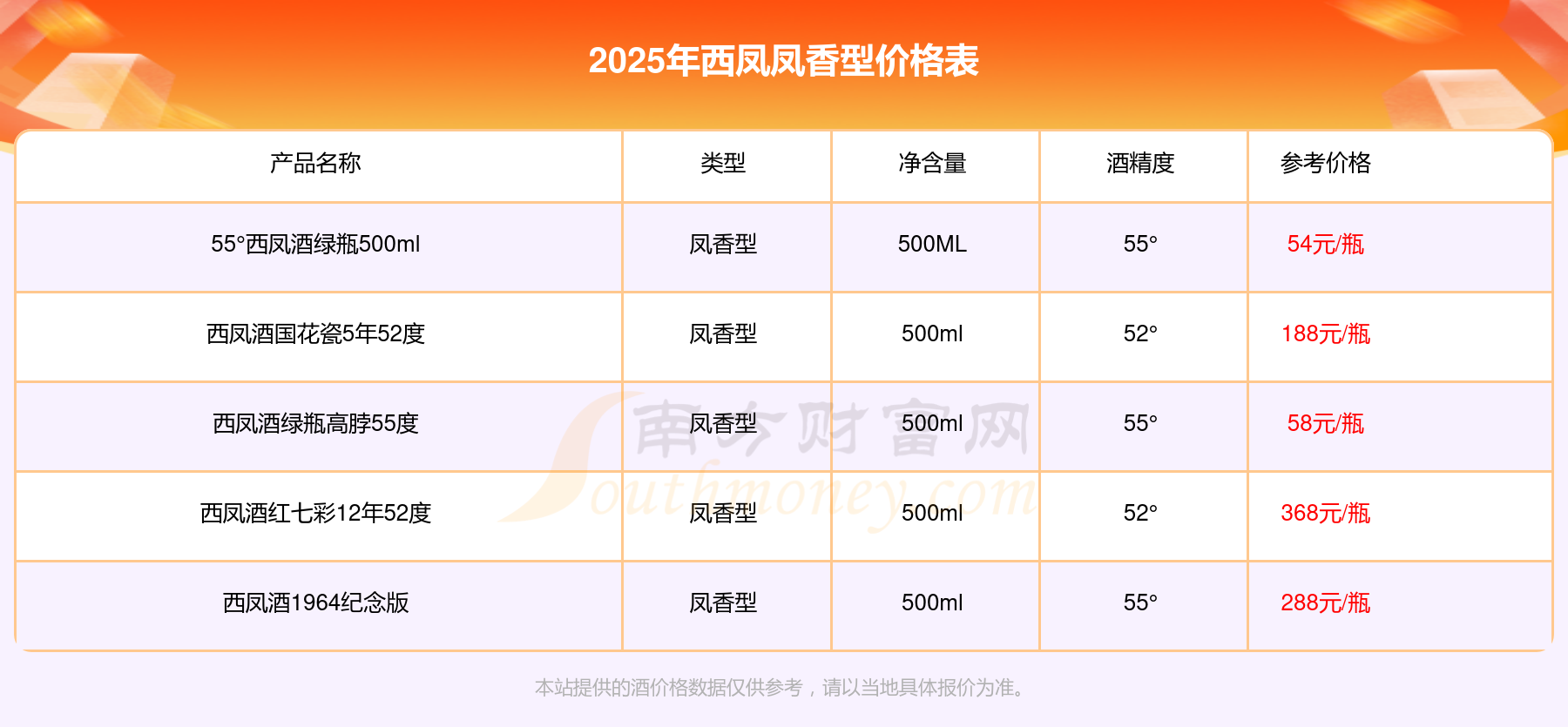 西凤凤香型酒价格最高的是西凤酒红七彩12年52度,参考价368元/瓶,最低的是55°西凤酒绿瓶500ml,参考价54元/瓶,价格高低差为314元/瓶。
