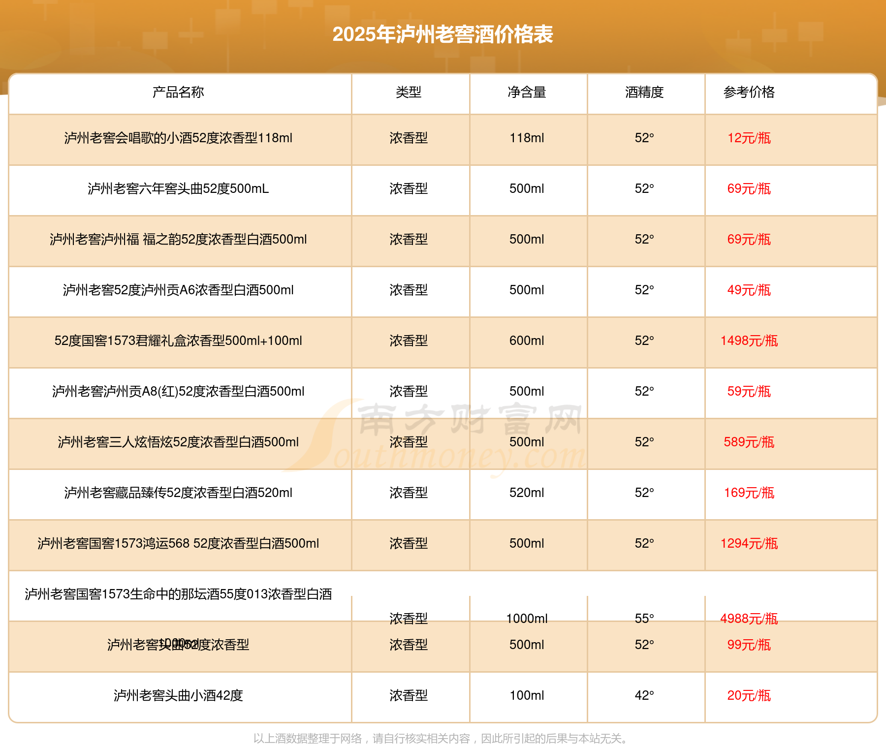 2025泸州老窖酒最新价格:泸州老窖国窖1573春酿鼠兆丰年E 55度参考价17999元/瓶、泸州老窖国窖1573生命中的那坛酒55度014参考价9999元/瓶、泸州老窖国窖1573春酿鼠兆丰年A 55度参考价5088元/瓶、泸州老窖国窖1573生命中的那坛酒55度013浓香型白酒1000ml参考价4988元/瓶、泸州老窖国窖1573生命中的那坛酒55度009 1000ml参考价4288元/瓶。