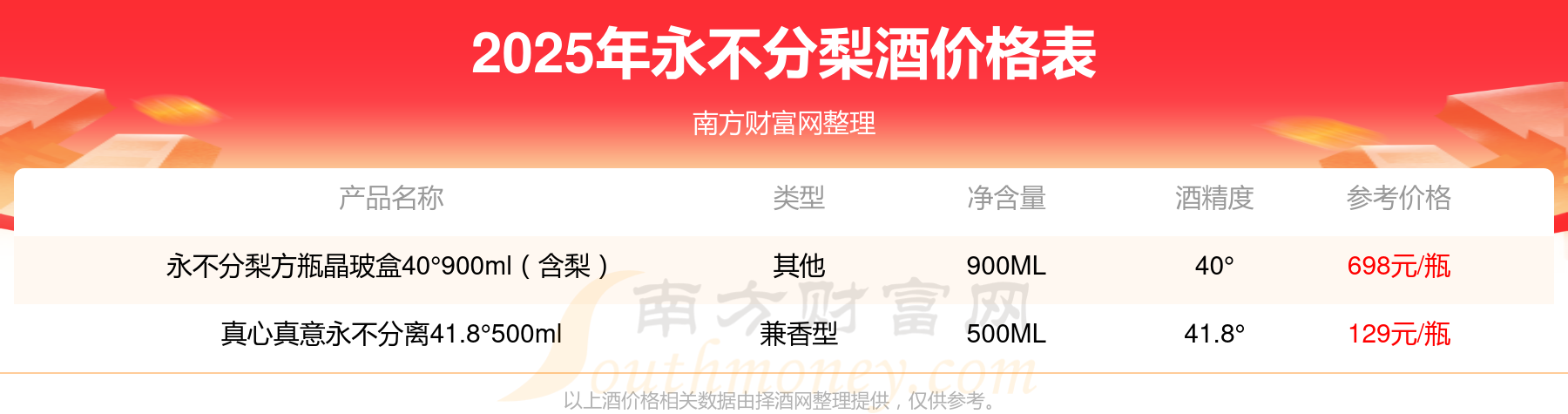 2025年,永不分梨方瓶晶玻盒40°900ml(含梨)、真心真意永不分离41.8°500ml等永不分梨酒价格如下: