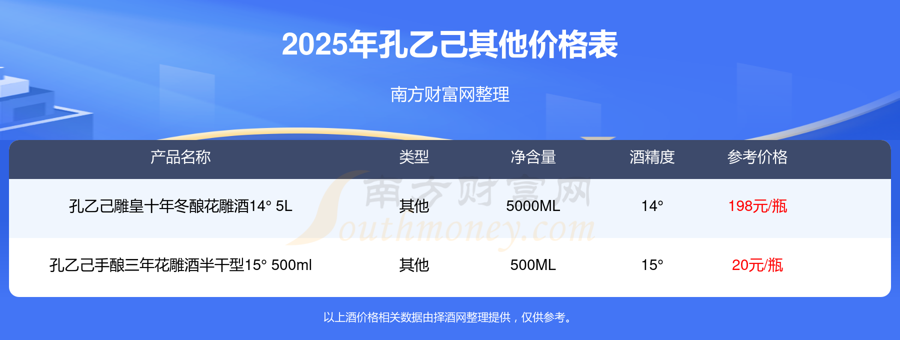 孔乙己其他酒最新价格2025:孔乙己雕皇十年冬酿花雕酒14° 5L参考价198元/瓶、孔乙己手酿三年花雕酒半干型15° 500ml参考价20元/瓶。