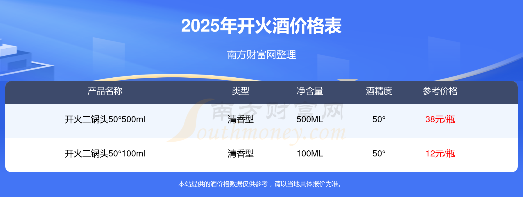 开火二锅头50°500ml参考价38元/瓶、开火二锅头50°100ml参考价12元/瓶。