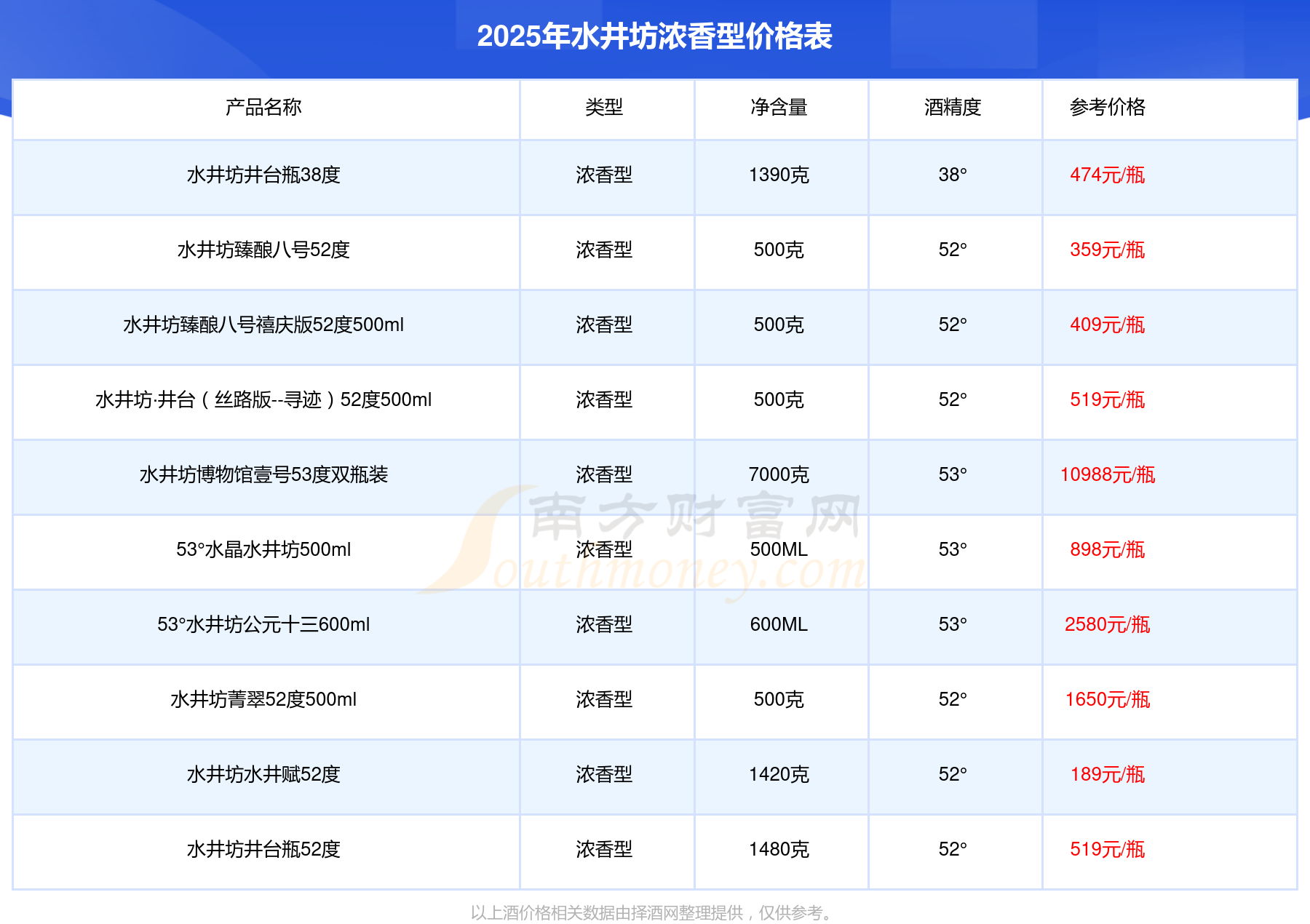 水井坊大坛收藏级原浆天球瓶66度参考价13999元/瓶、水井坊博物馆壹号53度双瓶装参考价10988元/瓶、53°水井坊公元十三600ml参考价2580元/瓶、水井坊梅兰竹菊52度浓香型600ml4瓶参考价1999元/瓶、水井坊菁翠52度500ml参考价1650元/瓶、井台珍藏版龙53度1000ml单瓶装参考价1298元/瓶、井台珍藏版凤53度1000ml单瓶装参考价1298元/瓶。