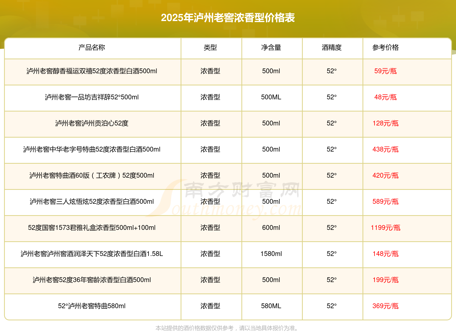 2025年,泸州老窖国窖1573春酿鼠兆丰年E 55度、泸州老窖国窖1573生命中的那坛酒55度014、泸州老窖国窖1573春酿鼠兆丰年A 55度、泸州老窖国窖1573生命中的那坛酒55度013浓香型白酒1000ml、泸州老窖国窖1573生命中的那坛酒55度009 1000ml、泸州老窖国窖1573中国品味52度浓香型白酒500ml、泸州老窖国窖1573许燎源概念作品58度浓香型白酒1000ml等泸州老窖浓香型酒价格如下: