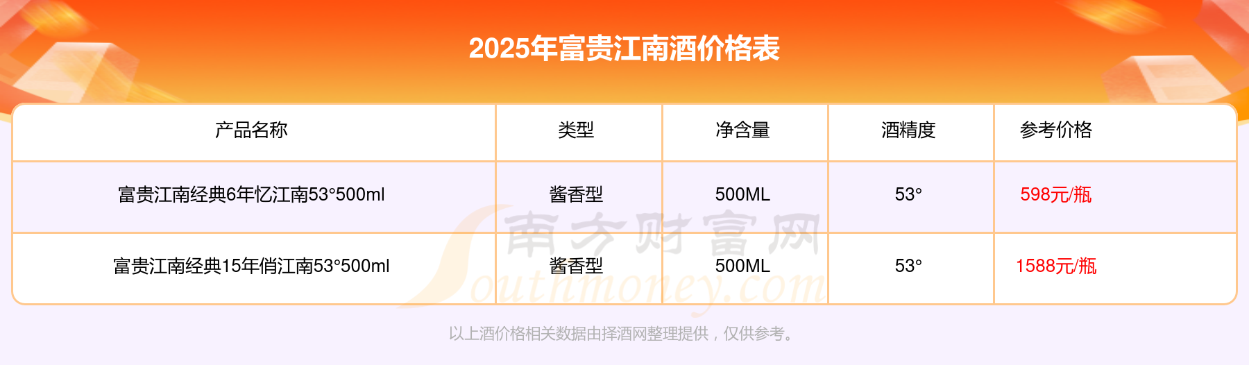 富贵江南酒最新价格2025:富贵江南经典15年俏江南53°500ml参考价1588元/瓶、富贵江南经典6年忆江南53°500ml参考价598元/瓶。