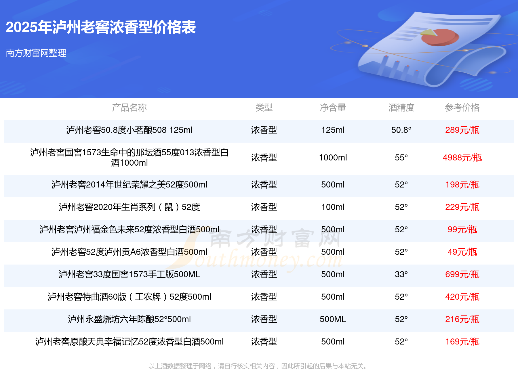 2025年,泸州老窖国窖1573春酿鼠兆丰年E 55度、泸州老窖国窖1573生命中的那坛酒55度014、泸州老窖国窖1573春酿鼠兆丰年A 55度等泸州老窖浓香型酒价格如下:泸州老窖国窖1573春酿鼠兆丰年E 55度参考价17999元/瓶、泸州老窖国窖1573生命中的那坛酒55度014参考价9999元/瓶、泸州老窖国窖1573春酿鼠兆丰年A 55度参考价5088元/瓶。