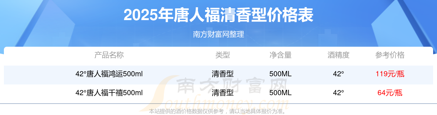 唐人福清香型酒最新价格2025:42°唐人福鸿运500ml参考价119元/瓶、42°唐人福千禧500ml参考价64元/瓶。