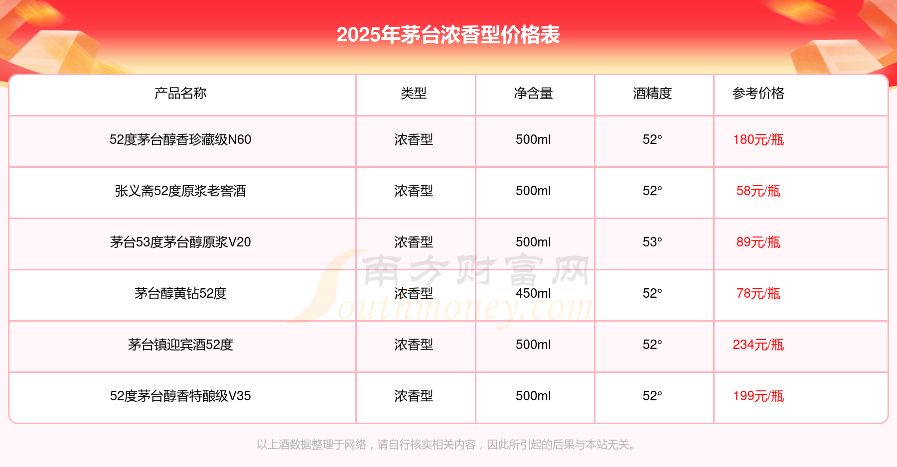 茅台镇迎宾酒52度参考价234元/瓶、52度茅台醇香特酿级V35参考价199元/瓶、52度茅台醇香珍藏级N60参考价180元/瓶、茅台53度茅台醇原浆V20参考价89元/瓶、茅台醇黄钻52度参考价78元/瓶。