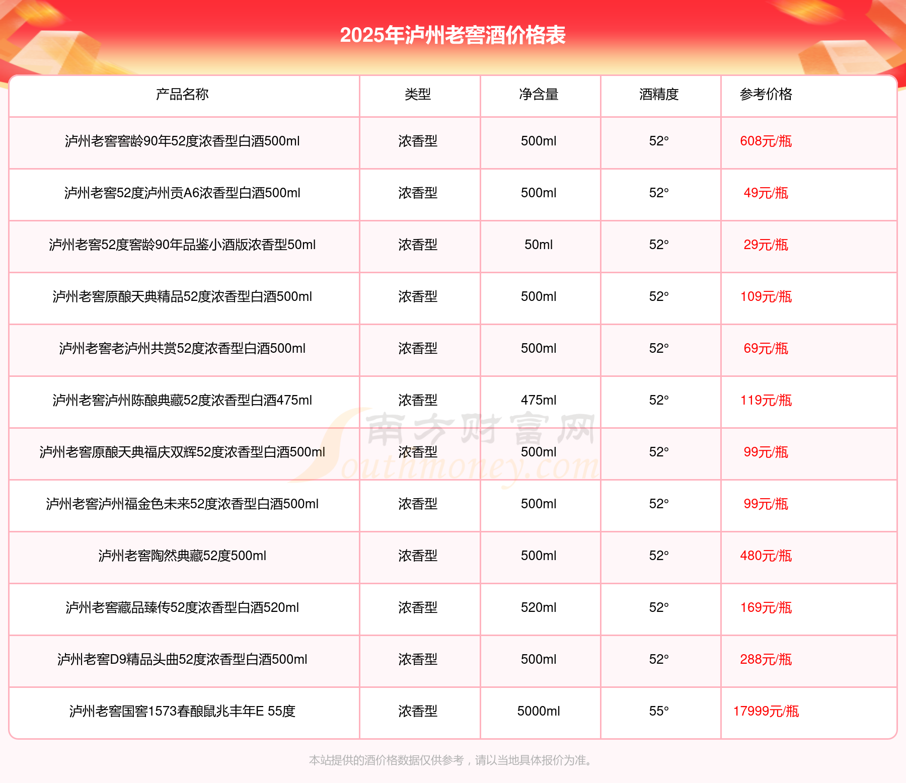 2025年,泸州老窖酒价格最高的是泸州老窖国窖1573春酿鼠兆丰年E 55度,参考价17999元,最低的是泸州老窖45度五洲醉8窖经典小酒版浓香型100ml,参考价10元,价格高低差为17989元。
