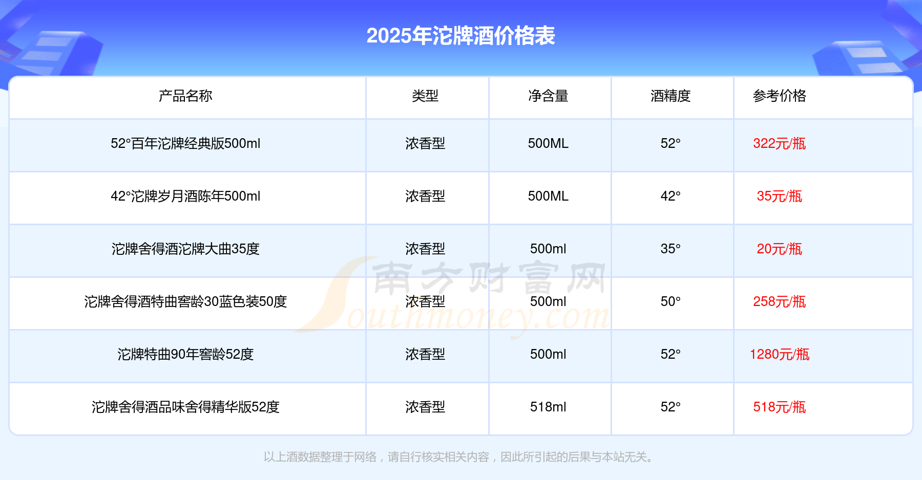 沱牌特曲90年窖龄52度参考价1280元/瓶、沱牌舍得酒品味舍得精华版52度参考价518元/瓶、52°百年沱牌经典版500ml参考价322元/瓶、沱牌舍得酒特曲窖龄30蓝色装50度参考价258元/瓶、42°沱牌岁月酒陈年500ml参考价35元/瓶、沱牌舍得酒沱牌大曲35度参考价20元/瓶。