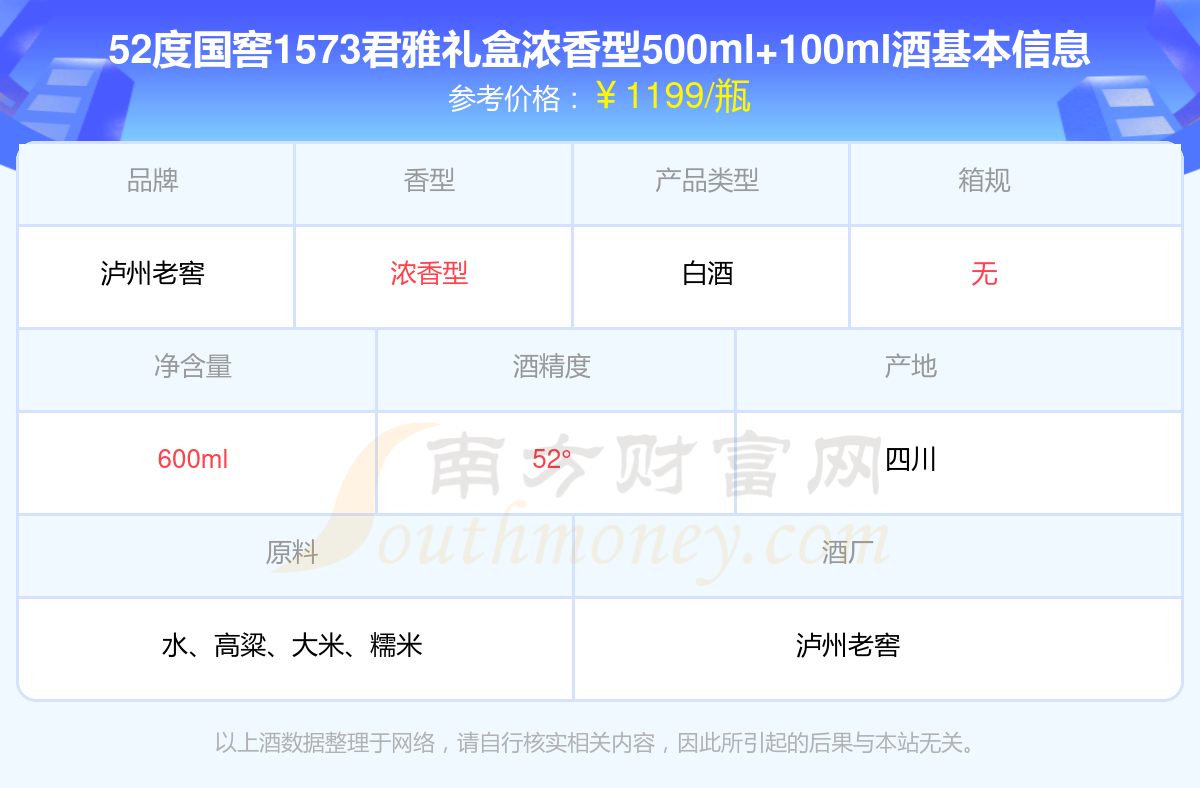 52度国窖1573君雅礼盒浓香型500ml+100ml基本信息