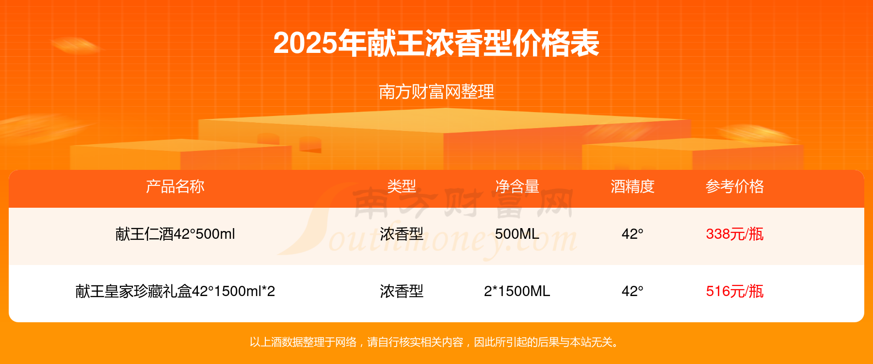 2025年,献王皇家珍藏礼盒42°1500ml*2、献王仁酒42°500ml等献王浓香型酒价格如下:献王皇家珍藏礼盒42°1500ml*2参考价516元/瓶、献王仁酒42°500ml参考价338元/瓶。