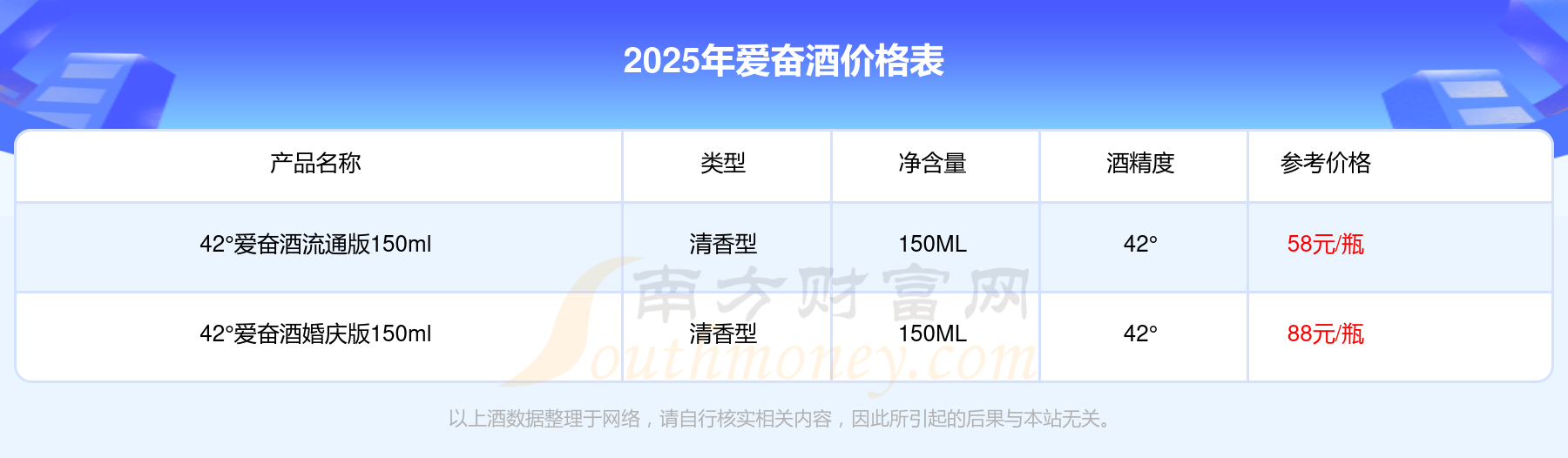 2025年,42°爱奋酒婚庆版150ml、42°爱奋酒流通版150ml等爱奋酒价格如下:42°爱奋酒婚庆版150ml参考价88元/瓶、42°爱奋酒流通版150ml参考价58元/瓶。