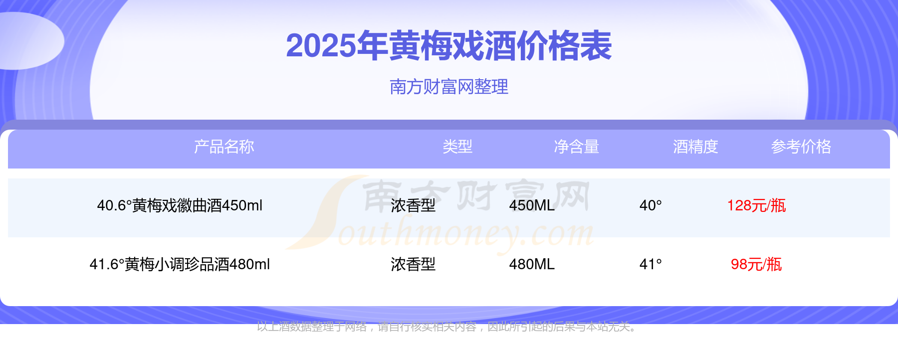 2025年黄梅戏价格最高的酒是40.6°黄梅戏徽曲酒450ml,参考价128元/瓶,最低的是41.6°黄梅小调珍品酒480ml,参考价98元/瓶,价格高低差为30元/瓶。