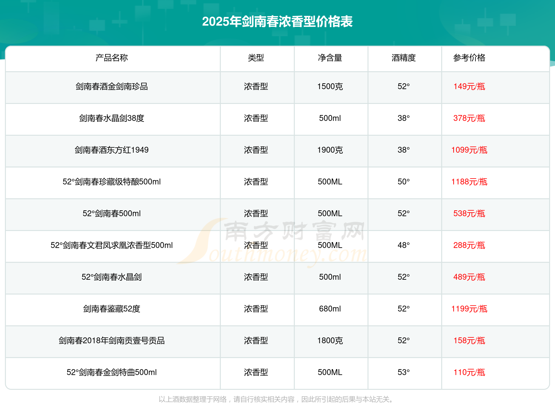 2025年剑南春浓香型酒剑南春鉴藏52度、52°剑南春珍藏级特酿500ml、剑南春酒东方红1949、52°剑南春500ml、52°剑南春水晶剑、剑南春水晶剑38度、52°剑南春文君凤求凰浓香型500ml等最新价格如下:剑南春鉴藏52度参考价1199元/瓶、52°剑南春珍藏级特酿500ml参考价1188元/瓶、剑南春酒东方红1949参考价1099元/瓶、52°剑南春500ml参考价538元/瓶、52°剑南春水晶剑参考价489元/瓶、剑南春水晶剑38度参考价378元/瓶、52°剑南春文君凤求凰浓香型500ml参考价288元/瓶。