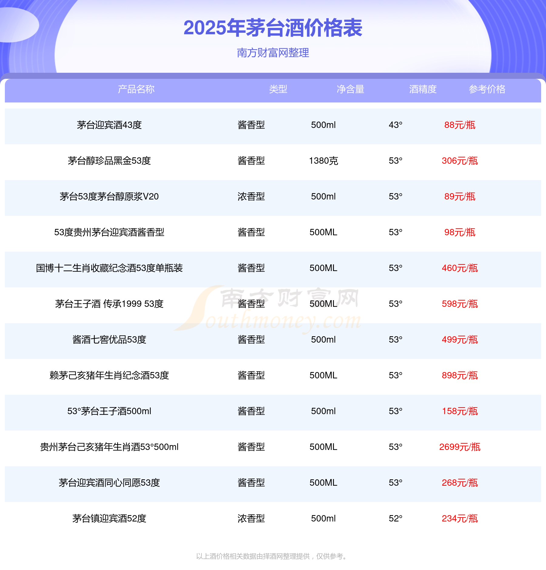 2025年茅台酒华茅鉴藏 酱香型白酒 3L 53°、53度五星茅台生肖酒丁酉鸡年、贵州茅台己亥猪年生肖酒53°500ml、53度五星茅台生肖酒戊戌狗年等最新价格如下: