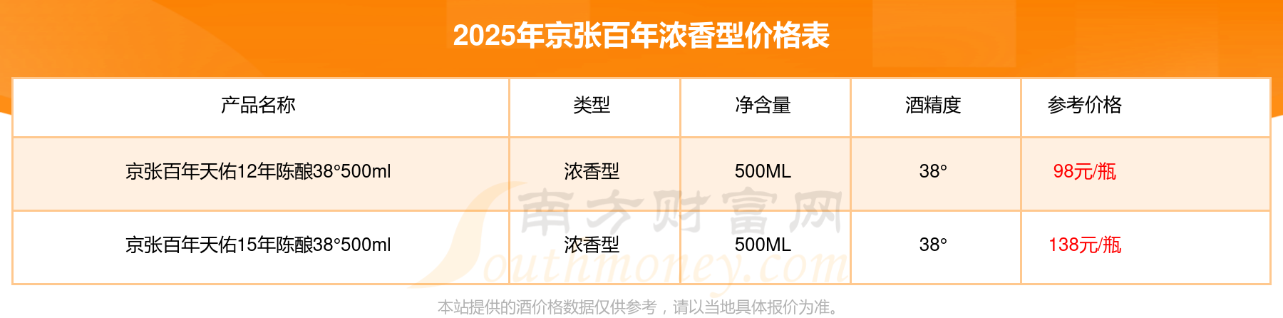 2025年京张百年浓香型酒京张百年天佑15年陈酿38°500ml、京张百年天佑12年陈酿38°500ml等最新价格如下:京张百年天佑15年陈酿38°500ml参考价138元/瓶、京张百年天佑12年陈酿38°500ml参考价98元/瓶。
