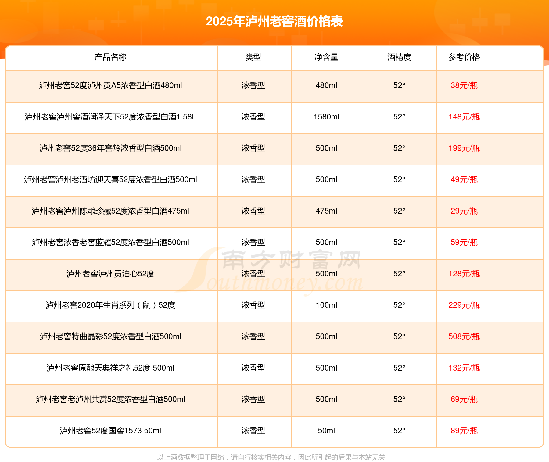 泸州老窖酒最新价格2025:泸州老窖国窖1573春酿鼠兆丰年E 55度参考价17999元/瓶、泸州老窖国窖1573生命中的那坛酒55度014参考价9999元/瓶、泸州老窖国窖1573春酿鼠兆丰年A 55度参考价5088元/瓶、泸州老窖国窖1573生命中的那坛酒55度013浓香型白酒1000ml参考价4988元/瓶、泸州老窖国窖1573生命中的那坛酒55度009 1000ml参考价4288元/瓶、泸州老窖国窖1573中国品味52度浓香型白酒500ml参考价2888元/瓶、泸州老窖国窖1573许燎源概念作品58度浓香型白酒1000ml参考价2680元/瓶、泸州老窖52度国窖1573狗年生肖礼盒参考价2143元/瓶。