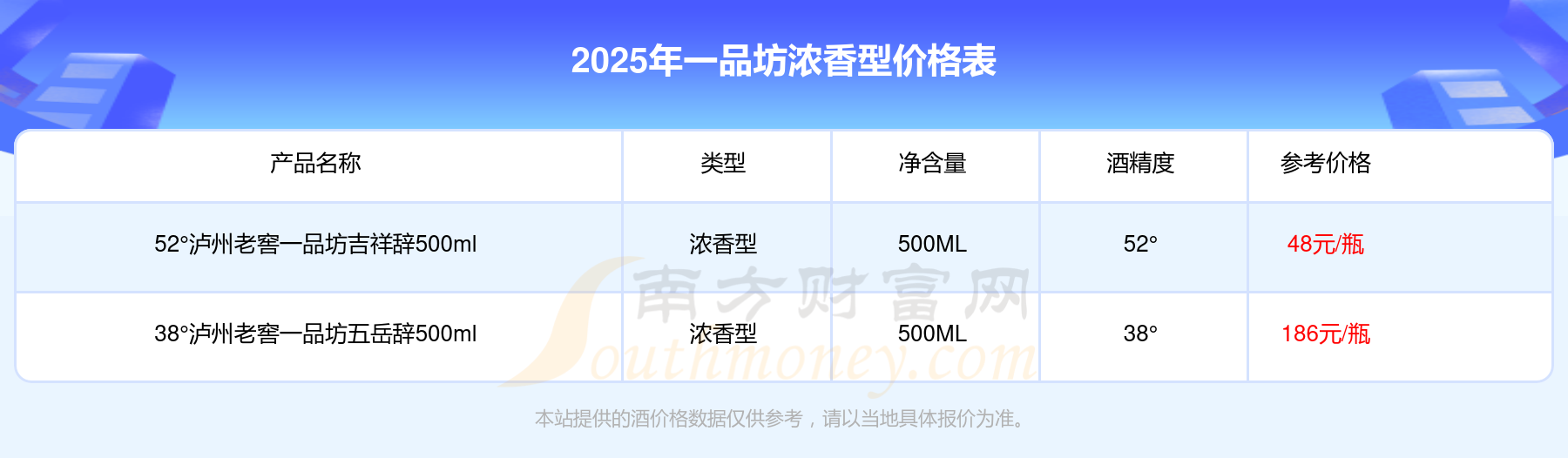 38°泸州老窖一品坊五岳辞500ml参考价186元/瓶、52°泸州老窖一品坊吉祥辞500ml参考价48元/瓶。