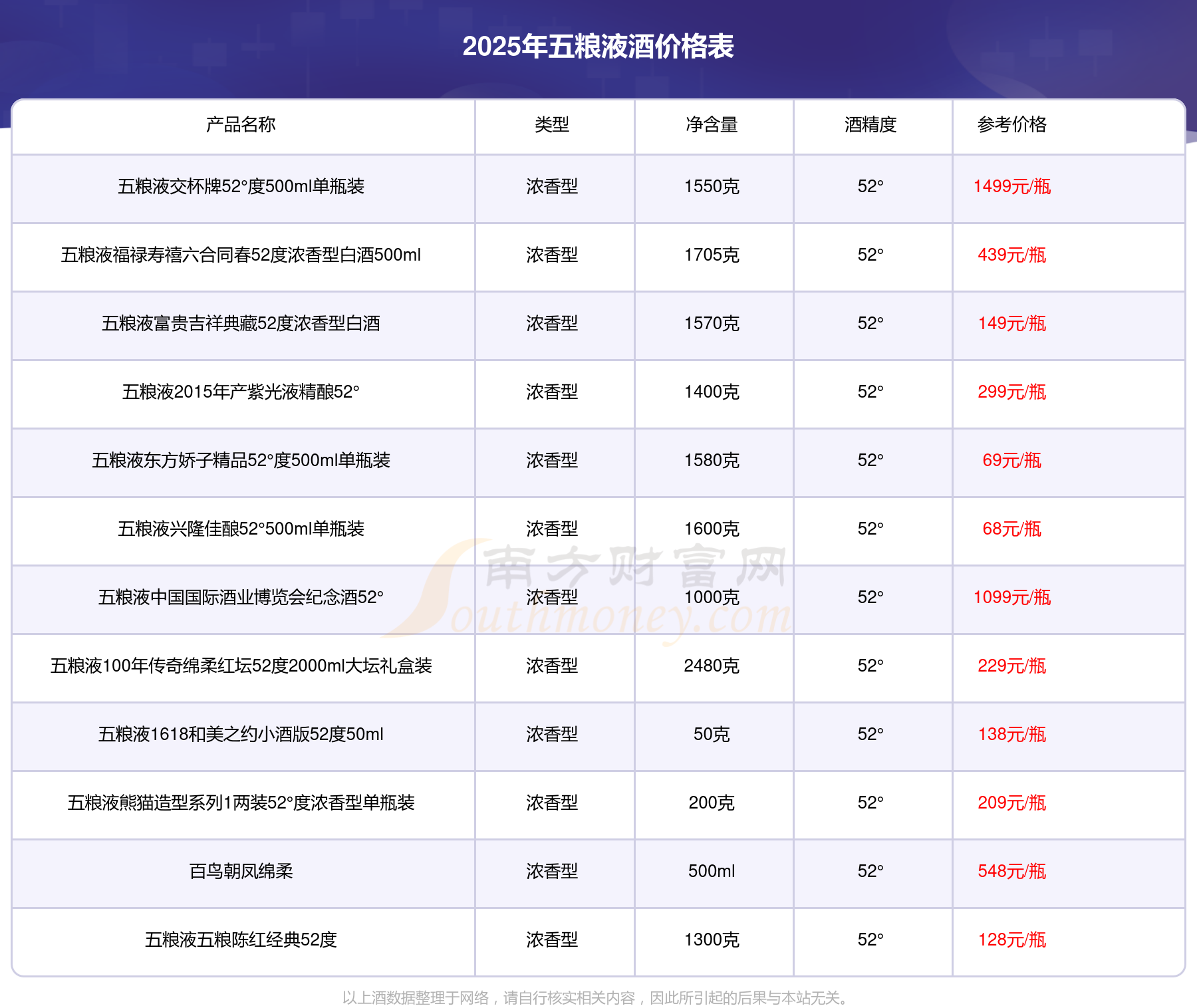 2025年,五粮液酒价格最高的是五粮液百年世博世纪荣耀纪念酒60°999ml,参考价26980元,最低的是五粮液干一杯小瓶46度,参考价16元,价格高低差为26964元。