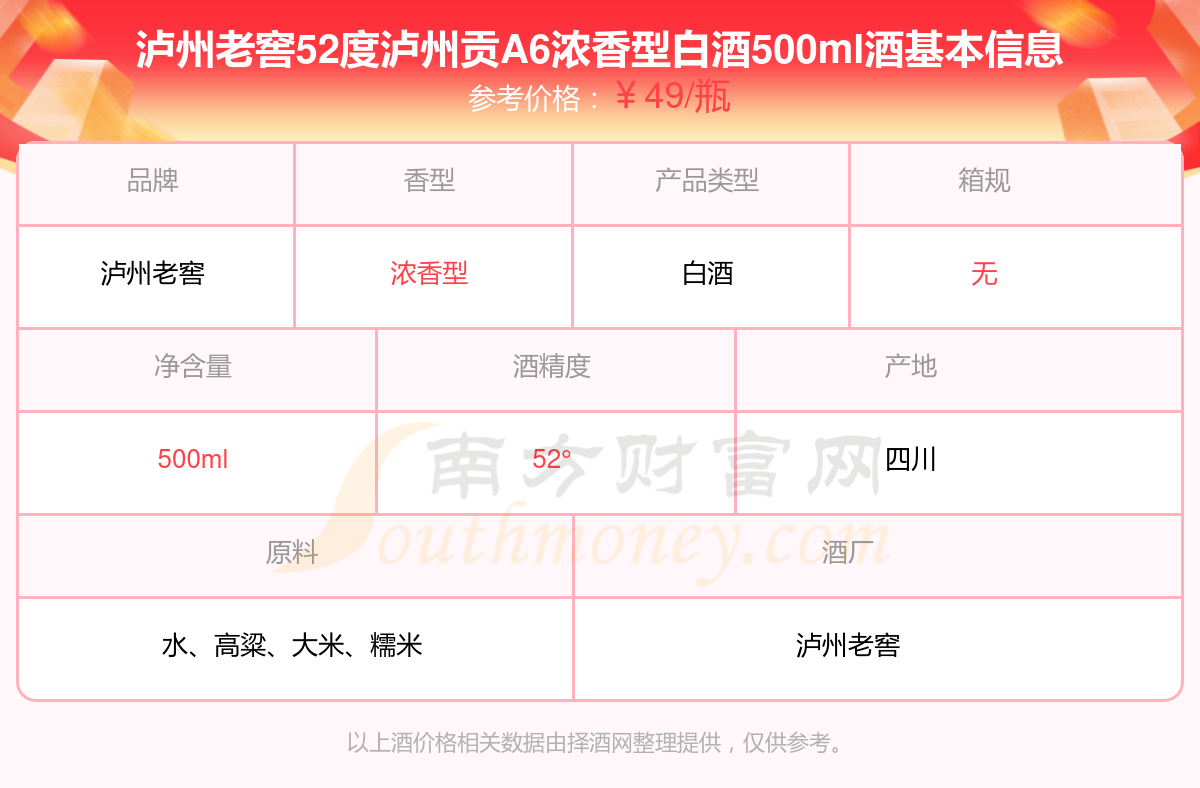泸州老窖52度泸州贡A6浓香型白酒500ml基本信息