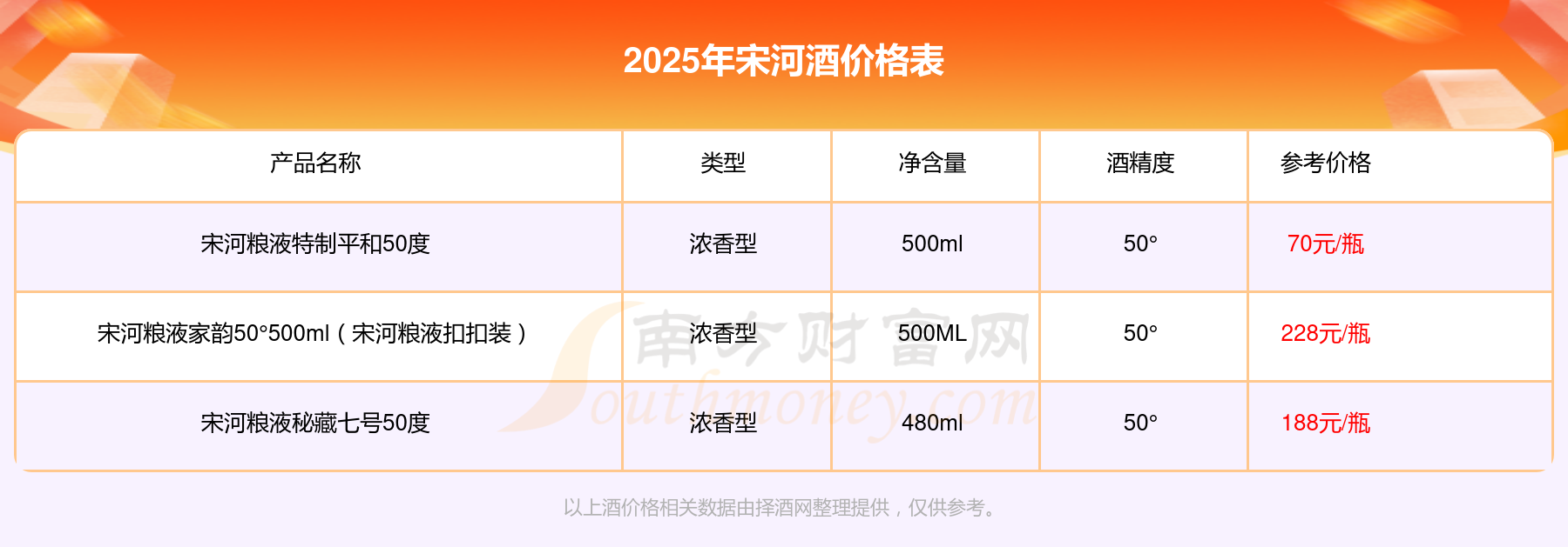 宋河粮液,1979年被评为河南省名优产品,1984年获轻工部银杯奖,1988年在全国名酒评比中,荣获国家金质奖和“中国名酒”称号。2004年荣获“中国驰名商标” ,2005年荣获“中国消费者十大满意品牌”及广东省首届国际酒饮博览会金奖,2006年,宋河粮液获得“白酒工业十大创新品牌”及“中华文化名酒”称号,2010年,宋河粮液被选为世博会河南省馆唯一指定用酒,2011年,注册商标“宋河”被国家商务部认定为“中华老字号”。