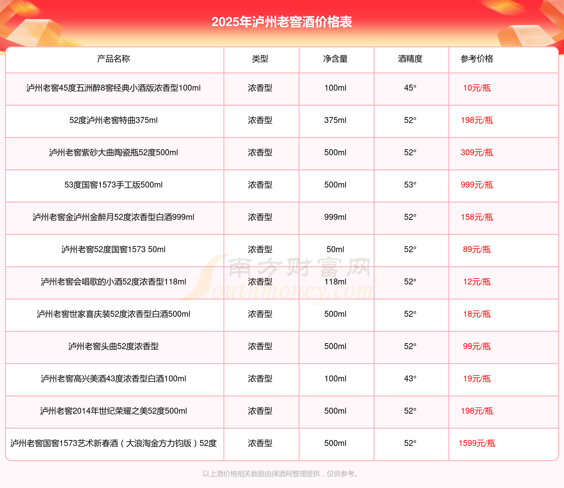2025泸州老窖酒最新价格:泸州老窖国窖1573春酿鼠兆丰年E 55度参考价17999元/瓶、泸州老窖国窖1573生命中的那坛酒55度014参考价9999元/瓶、泸州老窖国窖1573春酿鼠兆丰年A 55度参考价5088元/瓶、泸州老窖国窖1573生命中的那坛酒55度013浓香型白酒1000ml参考价4988元/瓶、泸州老窖国窖1573生命中的那坛酒55度009 1000ml参考价4288元/瓶、泸州老窖国窖1573中国品味52度浓香型白酒500ml参考价2888元/瓶、泸州老窖国窖1573许燎源概念作品58度浓香型白酒1000ml参考价2680元/瓶。
