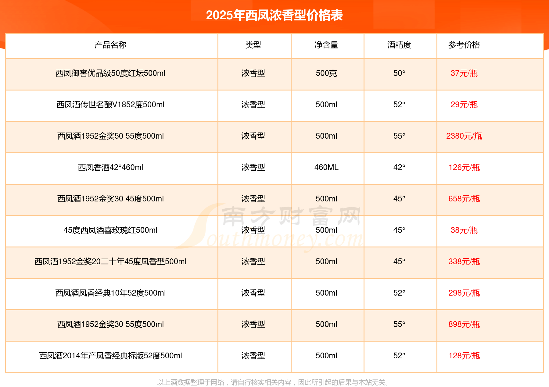 2025年,西凤酒 酒海私藏55度3000ml、西凤酒1952金奖50 55度500ml、西凤酒2013年产老酒凤香经典30年52度500ml、西凤酒1952金奖30 55度500ml、西凤酒凤香经典20年52度500ml、西凤酒1952金奖30 45度500ml等西凤浓香型酒价格如下:西凤酒 酒海私藏55度3000ml参考价8880元/瓶、西凤酒1952金奖50 55度500ml参考价2380元/瓶、西凤酒2013年产老酒凤香经典30年52度500ml参考价1280元/瓶、西凤酒1952金奖30 55度500ml参考价898元/瓶、西凤酒凤香经典20年52度500ml参考价768元/瓶、西凤酒1952金奖30 45度500ml参考价658元/瓶。